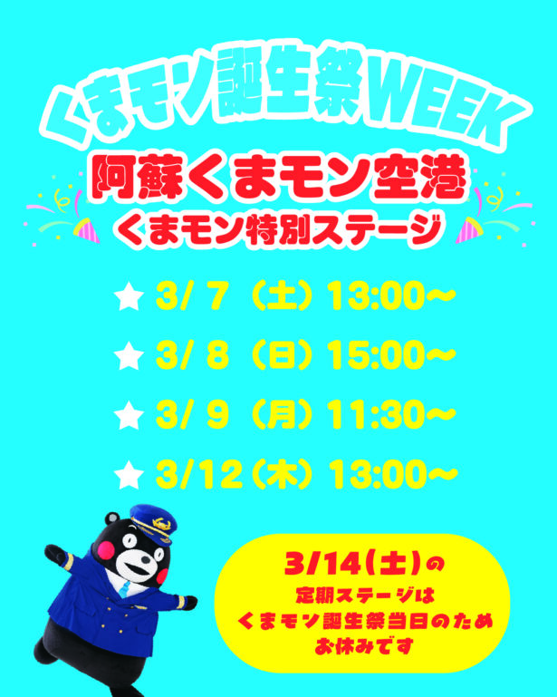 ※3月14日(土)は「くまモン誕生祭」が開かれるため、空港での定期ステージはお休みとなります。