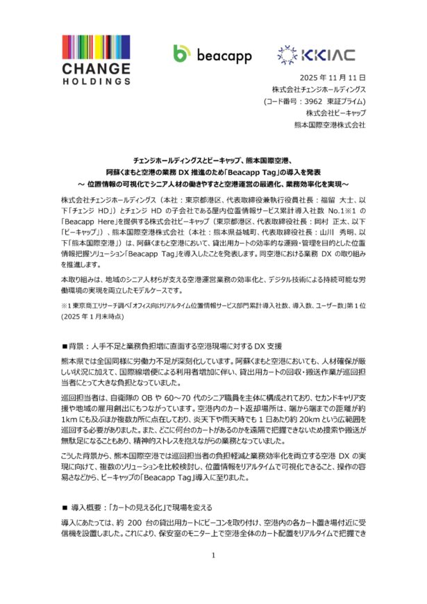 阿蘇くまもと空港 業務DX推進のため「Beacapp Tag」を導入しました