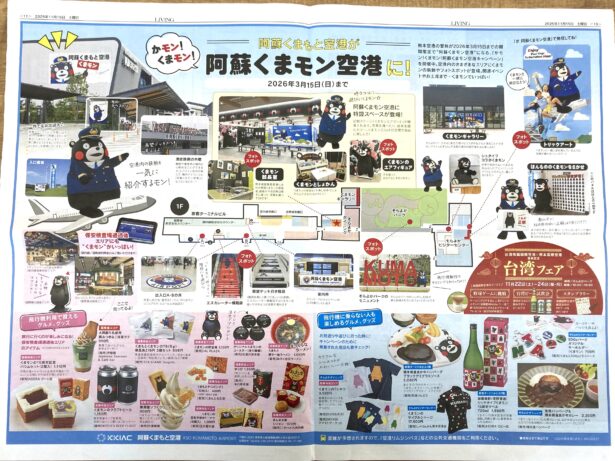 11月15日発行号の「リビング熊本」で、「阿蘇くまモン空港」の全容がどど〜んと2ページにわたって紹介されています。