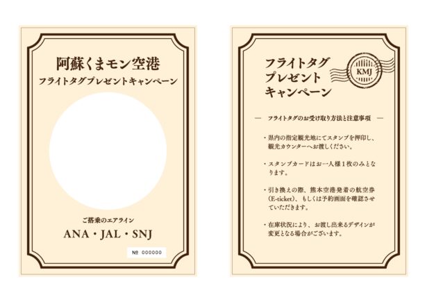 “阿蘇くまモン空港キャンペーン”を記念し、首都圏・関西圏から航空利用で観光にお越しいただいた方で、県内の主要観光地である阿蘇・天草・黒川温泉へ行かれた方に対し、航空会社とくまモンがコラボした特別記念フライトタグをプレゼントいたします。