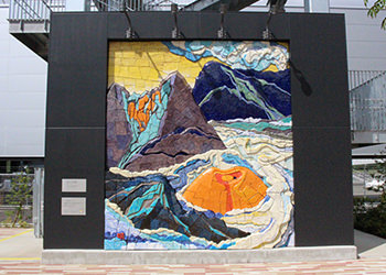 旧旅客ターミナルビルで展示していた、高津明美さんの陶板レリーフ「雲上の岳神」を移設しました。