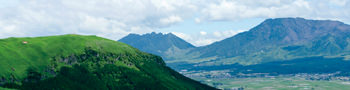 阿蘇地域は熊本県の東部、大分県・宮崎県との県境近くに位置しています。熊本県と大分県にまたがる、「阿蘇くじゅう国立公園」の多くを占め、年間を通して国内外から数多くの観光客が訪れています。阿蘇地域のシンボルは何と言っても、南北25km、東西18km、周囲128㎞という、世界最大級の大きさを誇るカルデラを有する活火山・阿蘇山。高岳、中岳、烏帽子岳、杵島岳、根子岳の阿蘇五岳を中心に、外輪山も含めて阿蘇山と呼ばれています。阿蘇地域には圧倒的なスケールの大自然が広がり、その独特の景観は必見。特にダイナミックな風景を眺められる「中岳第一火口」や阿蘇五岳からくじゅう連山を見渡せる「大観峰」、目前に広がる草原の先に阿蘇中岳を望む「草千里」などが特に人気です。周辺には「内牧温泉」「栃木温泉」「赤水温泉」など、火山の恵みを感じられる数多くの温泉地があり、宿泊施設も充実しています。また、阿蘇を訪れたら赤身が多くさっぱりとした味わいの「あか牛」などのグルメも楽しみです。